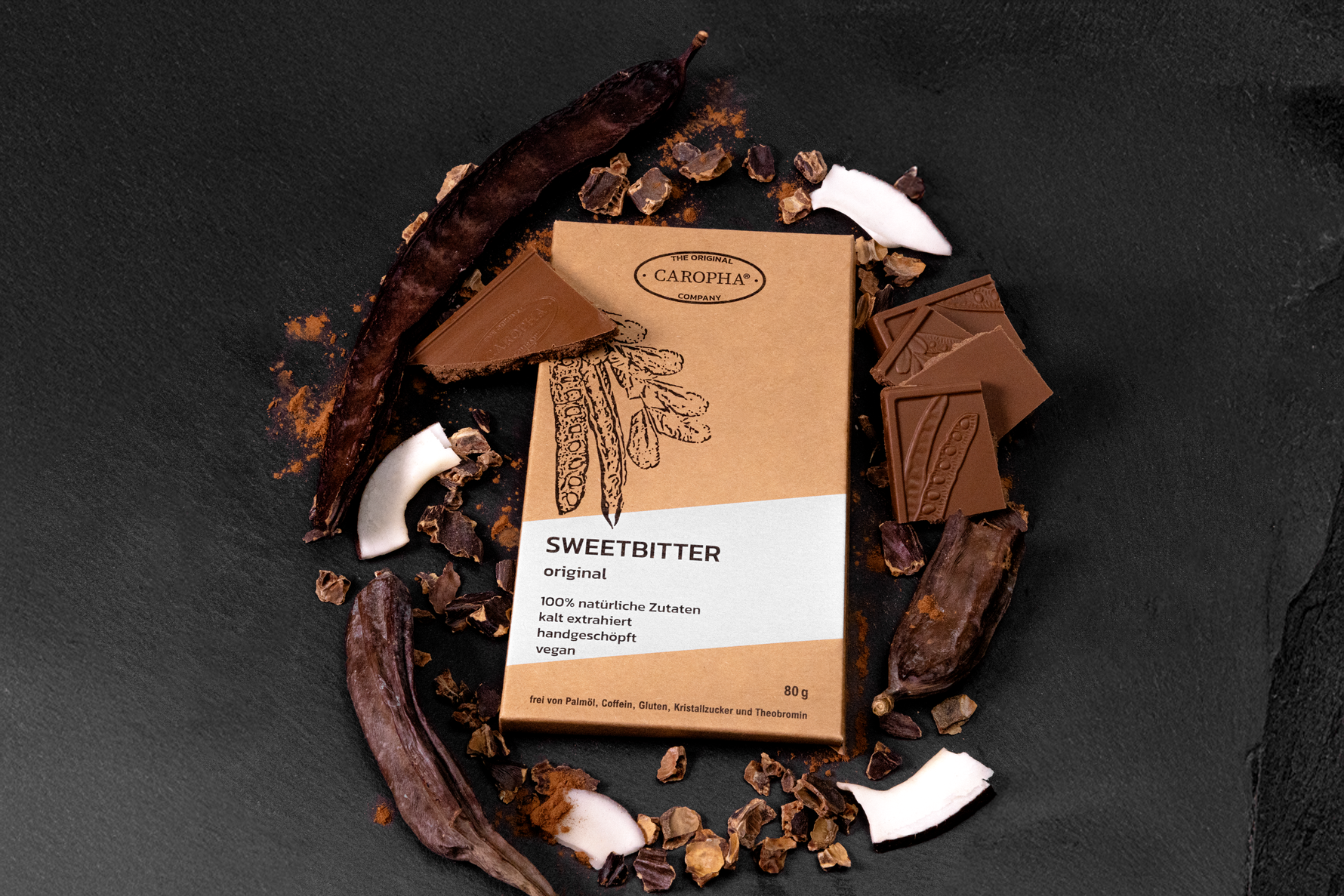 Caropha ist eine pflanzliche Schokoladenalternative auf Basis des Johannisbrotbaums (Carob).
